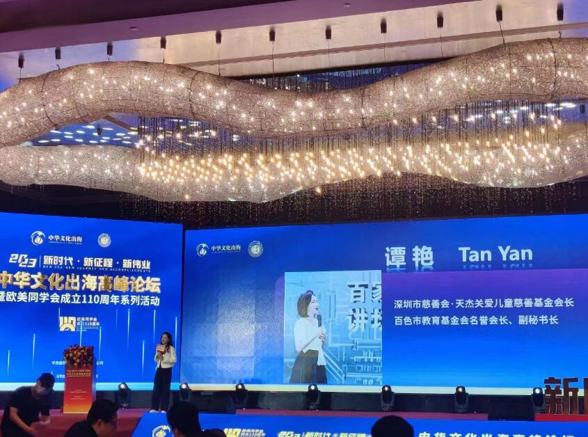 慈善晚会上,天杰关爱儿童慈善基金会会长,中华文化出海项目联合发起人之一的谭艳女士,讲述了她的慈善心路历程,并汇报了现状以及工作成果,截止2022年底,已资助了280个求学的孩子,对标援助了27所村镇学校的基建工程和2个文秀班。谭会长表示“慈善和教育是我们毕生奋斗的目标”,呼吁更多的爱心人士参与到社会公益事业来。
