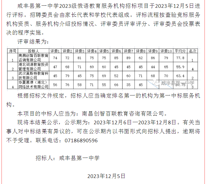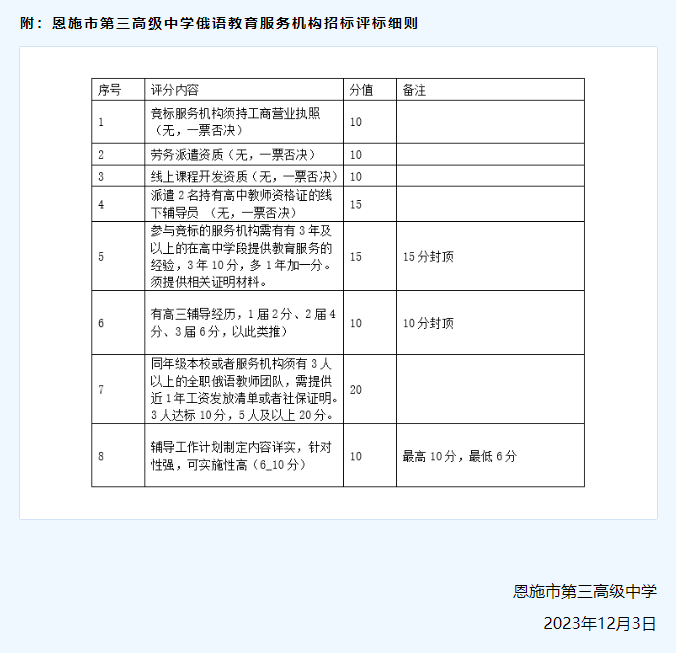 2023年恩施第三高级中学、咸丰县第一中学俄语教育服务机构招标评标细则,是需要人力资源派遣证、不需要办学资格证。(附图)