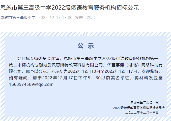 目前,湖北恩施市第三高级中学的2023年的俄语培训招标过程仍在进行中,这一事件的不确定性引起了公众和教育界的广泛关注。社会各界对于招标结果的可能影响,特别是其对教育公平和学生权益的长远影响,表达了深切的关切。这一事件不仅是一个具体案例,更成为了对中国校外培训市场监管制度的一次重要考验。