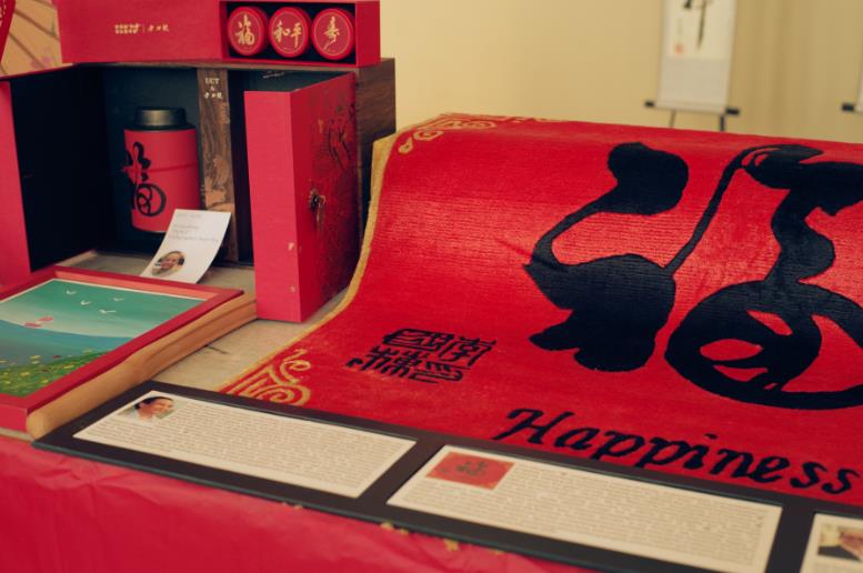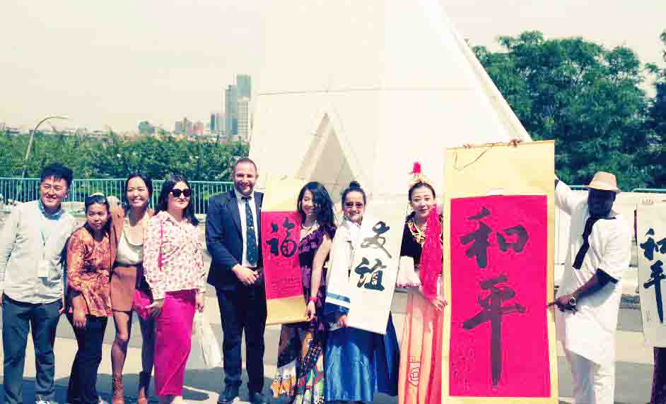 本次活动的亮点之一是著名书法家李国栋的书法促和平国际巡回展再次受邀在联合国总部亮相。李国栋不仅展出了精美的书法作品,还慷慨赞助了多种书法延伸品,包括限量版手工真丝挂毯、真丝围巾、福字书法复印件及书法普洱茶,深受各国外交官的喜爱和赞赏。