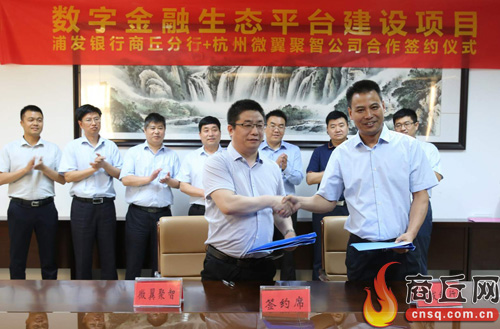 6月1日,浦发银行商丘分行与杭州微翼聚智公司在市政府金融办举行“数字金融生态平台建设项目”签约仪式。市政府金融办、睢阳区政府金融办、浦发银行郑州分行、杭州微翼聚智公司相关负责人出席此次仪式。