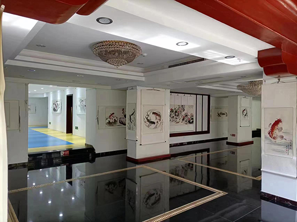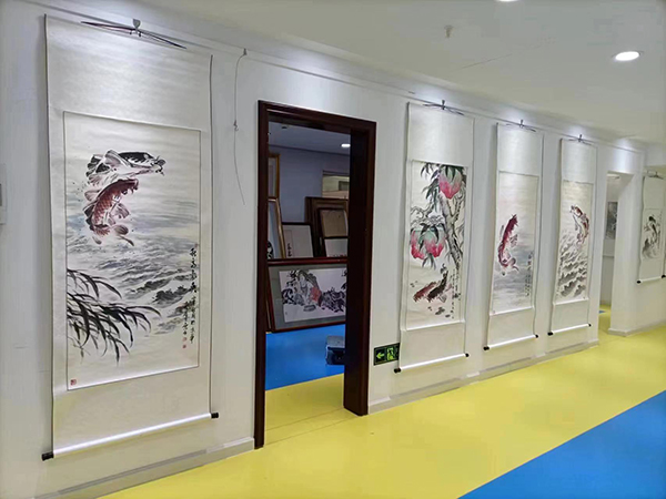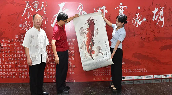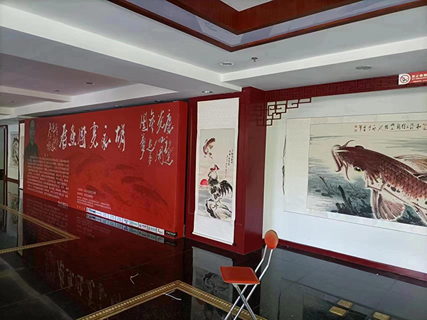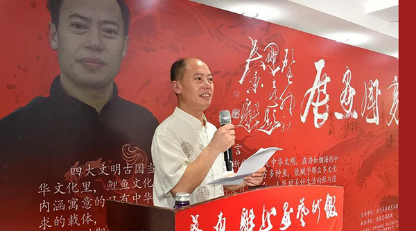 画家胡永亮对各位来宾参加他的个人画展表示衷心的感谢,胡永亮说:感谢恩师蔡可刚教会了我一个养家糊口手艺,也谢谢师母的谆谆教导,使我才有了今天的小小的成绩。感谢吴东魁提供的吉祥宝地,让我在首都北京有一个展示作品的机会。诚恳的请大家参观画展时多提宝贵意见!这次特为艺术馆画了一幅九鲤化龙图。展览共展出以鲤鱼跃龙门作为主题的作品78幅。