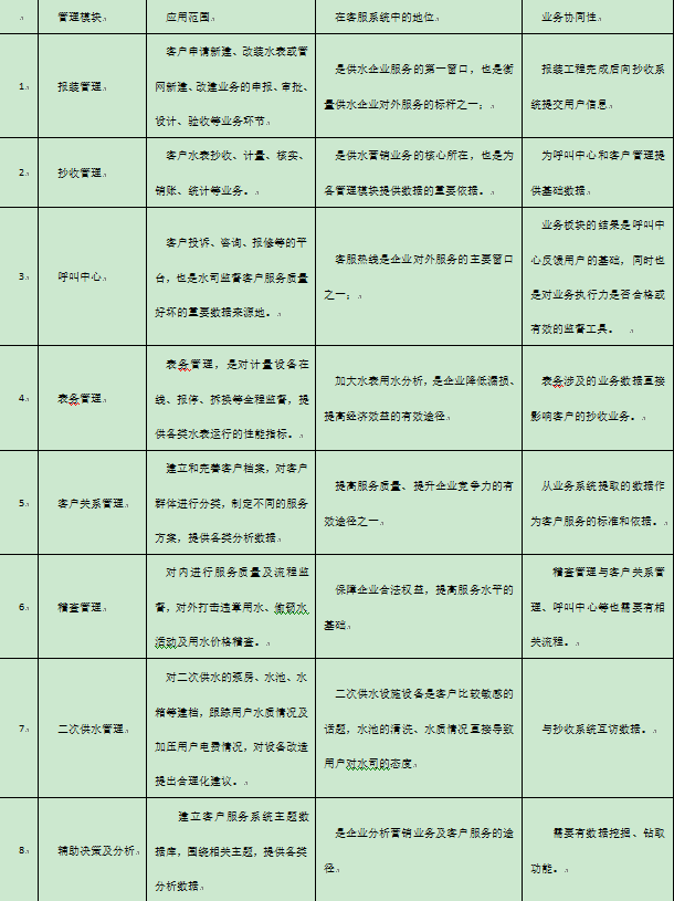微观层面,更具有务实性。对应用者来说,无论是供应商还是使用商,要真正落地,就必须对智慧水务软件平台的功能,逐一进行验证与排查,一是考察架构性上是否存在缺陷;二是解决问题的过程中,是否存在偏差。 以客户服务系统为例,在一般的管理平台中,客户服务系统涵盖以下内容(见下表):管理模块 、应用范围、 在客服系统中的地位、 业务协同性。